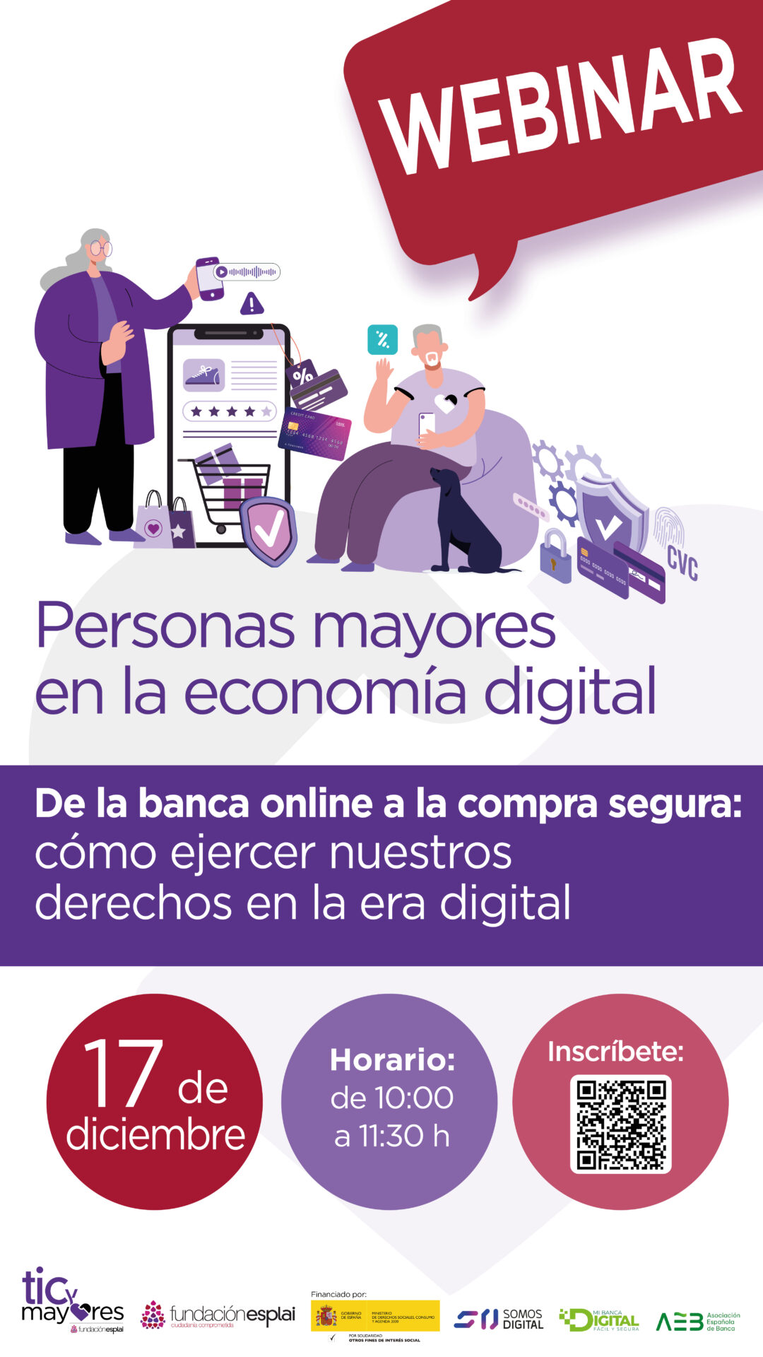 El próximo 17 de diciembre a las 10:00 h a 11:30, te invitamos a un webinar para aprender cómo la banca online y las compras digitales pueden ser seguras y accesibles para las personas mayores. Presentaremos herramientas prácticas como el proyecto Mi Banca Digital y el emulador de compra online, diseñadas para acompañarte en esta transformación.