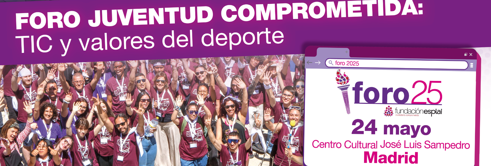Bajo el lema “Juventud Comprometida con las TIC y los Valores del deporte”, los días 23,24 y 25 de mayo de 2025 en Madrid, se celebra el principal encuentro anual de la Fundación Esplai Ciudadanía Comprometida, en su décima edición, con actividades abiertas a toda la ciudadanía en la que participan jóvenes de toda España: el #ForoFE25, #ForoFEValoresdeldeporte. El Foro Juventud Comprometida es un evento educativo y recreativo en el que los y las jóvenes que participan en los proyectos y actividades de Fundación Esplai se reúnen para presentarlos a la ciudadanía.