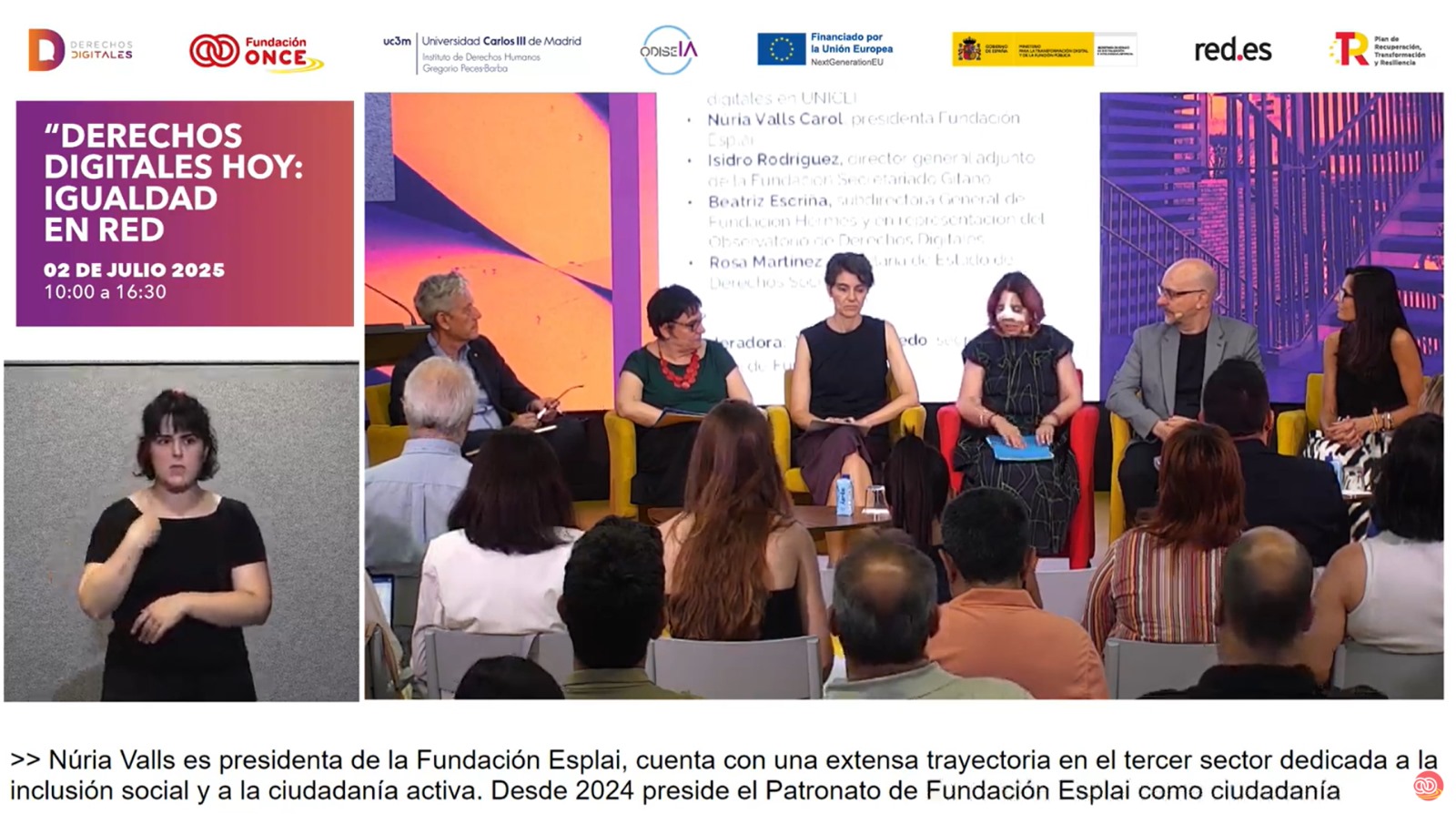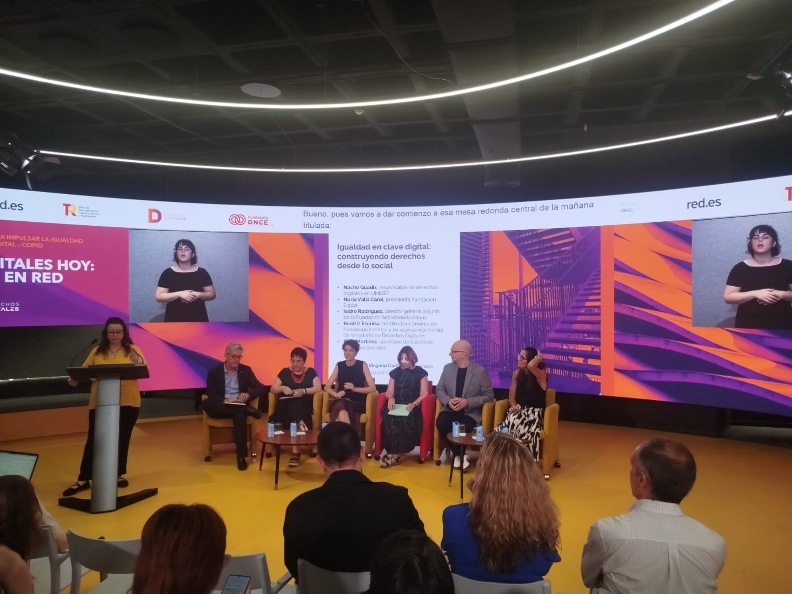 Además, han participado en la mesa: Nacho Guadix, responsable de derechos digitales de UNICEF, Isidro Rodríguez, director general adjunto de la Fundación Secretariado Gitano, Beatriz Escriña, subdirectora General de Fundación Hermes y Rosa Martínez, secretaria de Estado de Derechos Sociales. Ha moderado la mesa Virginia Carcedo, secretaria general de Fundación ONCE.